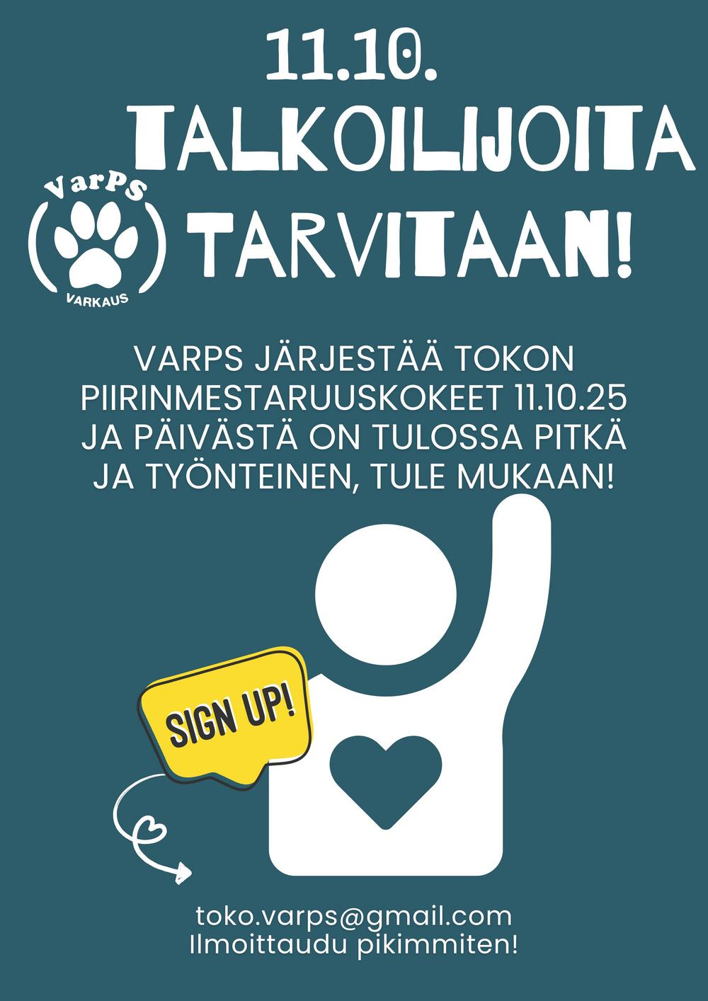 Tervetuloa mukaan talkoilemaan tottelevaisuuskokeisiin VarPS Areenalle 11.10.25! Toimenkuvia on myös vasta-alkajillekin ja talkoopäivän pituuden vuoksi erityisesti iltasiivoukseen tarvitaan apuvoimia…