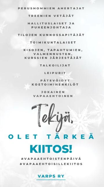 Vastaa kommentoiden aiheen julkaisuun VarPSin somessa (face tai insta) tai alla olevalla lomakkeella 11.12. mennessä. Arvonta suoritetaan vastanneiden VarPSin jäsenten kesken 12.12.25.